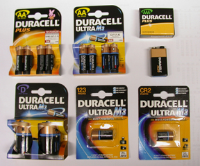 Batterien: wir vertreiben die gesamte Produktpalette der Firma Duracell, d.h. Batterien und Akkus von Knopfzellen über Rundzellen, 9VBlöcke, sowie auch Taschenlampen, Ladegeräte.